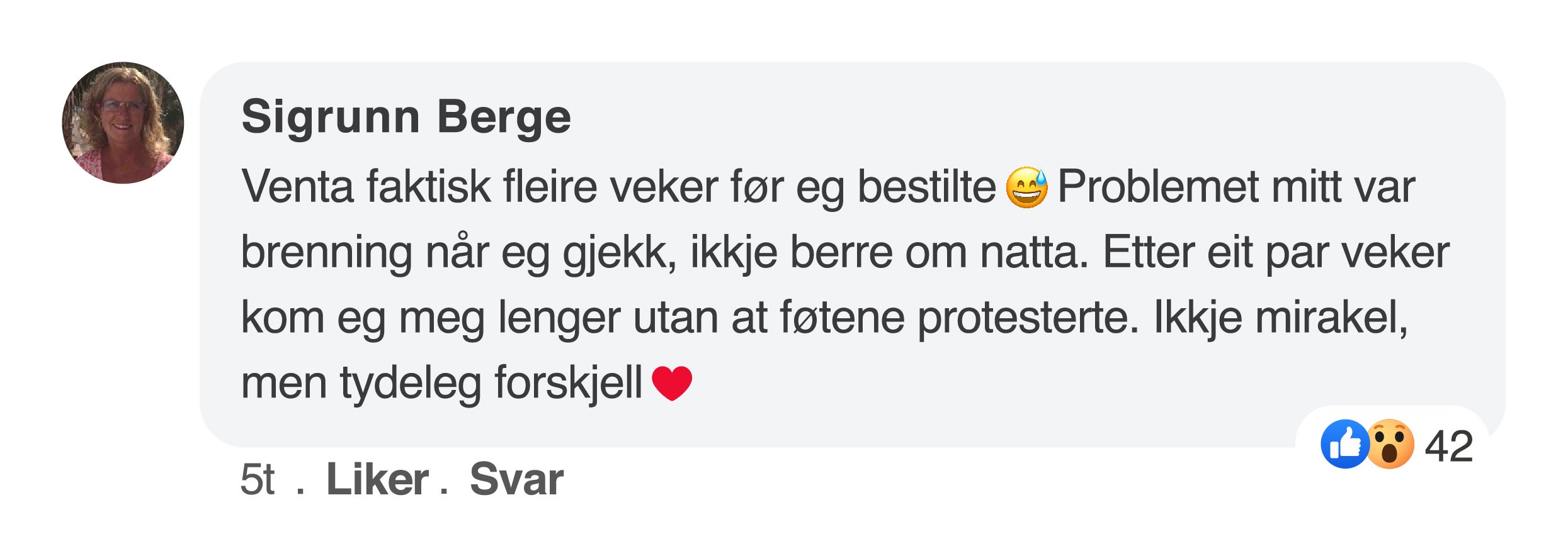 «Venta faktisk fleire veker før eg bestilte. Problemet mitt var brenning når eg gjekk – ikkje berre om natta. Etter eit par veker kom eg meg lenger utan at føtene protesterte. Ikkje noko mirakel, men ein tydeleg forbedring»